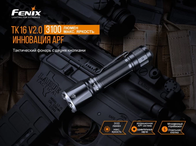 Важная особенность TK16 V2.0 – использование усовершенствованной системы передачи импульсно-частотных сигналов – APF. Именно эта разработка позволила добиться максимальной мощности до 3100 люменов. Традиционная кнопка включения имеет ограничения по току и не позволяет достигать такой яркости.