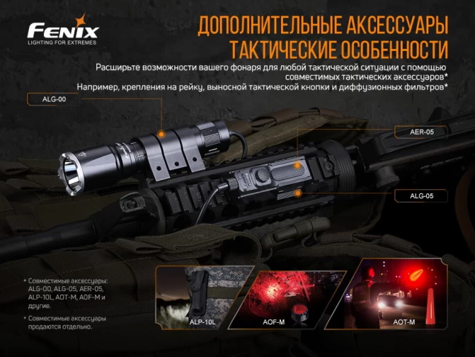 Для повышения комфорта эксплуатации и расширения функций фонаря используйте специальные аксессуары. Данной модели подойдут: ALG-00 – крепление на оружие, AER-5 – выносная кнопка и крепление для нее – ALG-05, цветовой фильтр AOF-M и сигнальный – AOT-M.