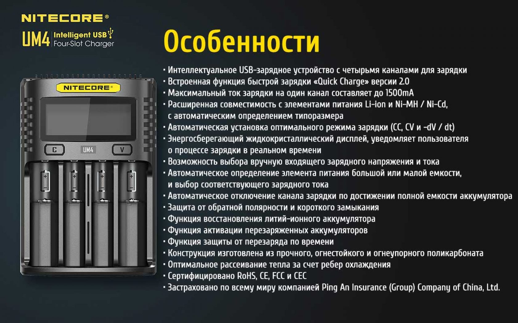 Встроенный порт USB micro обеспечивает не только качественную и быструю передачу питания, но и позволит подключать устройство к портативным или альтернативным источникам питания: солнечным панелям, Powerbank, зарядным станциям, ноутбукам и различным адаптерам. Таким образом Вы не будете привязаны к розетке и сможете использовать UM4 в автомобиле, в походах, на прогулке и т.п. Рекомендовано производить зарядку только с помощью фирменных кабелей компании Nitecore.