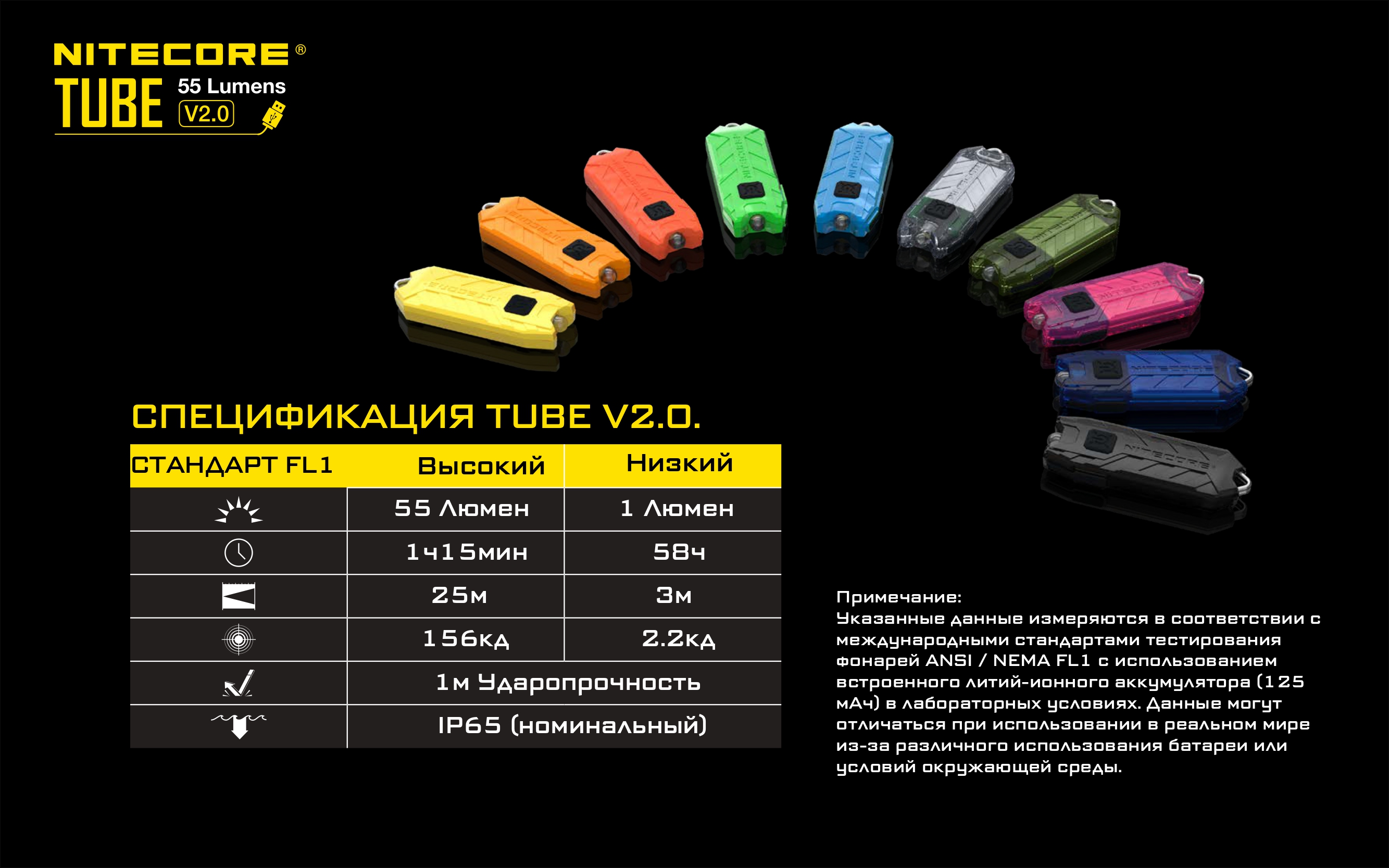 TUBE V2.0 имеет встроенный литий-ионный аккумулятор небольшого размера, от которого может непрерывно работать до 58 часов. Чтобы зарядить этот аккумулятор, потребуется всего лишь подключить кабель с разъемом micro-USB к какому-либо источнику питания, в том числе портативному: powebank, ноутбук или другой прибор. Корпус Nitecore TUBE V2.0 изготавливается из современного полимерного материала — поликарбоната. Он достаточно прочный, чтобы фонарь мог выдержать даже падение с высоты роста человека на бетон или камни. В то же время этот материал очень легкий. Поверхность корпуса сделана текстурной, что не только украшает наключный фонарик, но и не дает ему скользить в руках. Чтобы Nitecore TUBE V2.0 удобно крепился к ключам, в хвостовой части его корпуса размещено стальное кольцо, выдерживающее нагрузку до 35 кг. Фонарик сделан пыленепроницаемым и защищенным от брызг.
