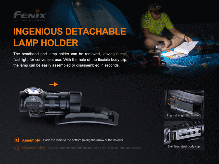 Максимальная яркость этого фонаря 700 люмен в ультралегком корпусе 78 грамм. Угол освещения составляет 180 градусов, что удовлетворяет различным требованиям к широкоугольному освещению. Налобный и ручной фонарь в одном с клипсой, которая освобождает руки. Он вынимается за секунды из налобного крепления.