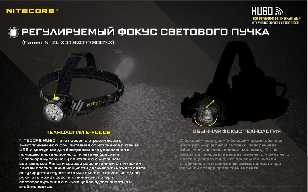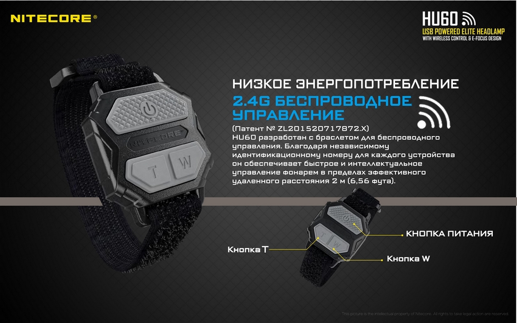 Высокопроизводительный фонарь Nitecore HU60 разработан для таких сфер, где очень важна продолжительность работы от одного заряда. Поэтому производитель подразумевает, что фонарь будет питаться от powerbank. Разработана специальная серия устройств NPB, которая не только соответствует техническим требованиям устройства, но и является влагозащищенной с возможность погружения под воду на глубину до 2-х метров.